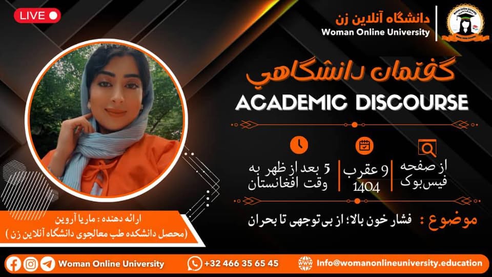 در این گفتمان بانو ماریا آروین (محصل دانشکده طب معالجوی دانشگاه آنلاین زن ) در مورد فشار خون بالا؛ از بی توجهی تا بحران خواهد پرداخت لذا از تمام دانشجویان و علاقمندان که خواهان اشتراک در این برنامه علمی هستند دعوت میشود تا در این برنامه علمی شرکت کرده و به معلومات خویش بیفزایند.